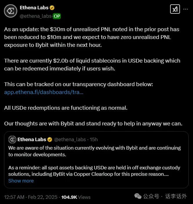 其实回顾过去十多个小时的情况来看,到目前为止,Bybit 的公关处理也做的不错,比如事件发生 30 分钟内,Bybit CEO 就在 X 平台进行了回应,随后的 10 分钟内,Bybit 的官方账号也同时发布了官方声明,然后 CEO 还开启了直播解答一些社区疑问,这种处理速度和态度对市场情绪的暂时稳定还是比较有帮助的。
