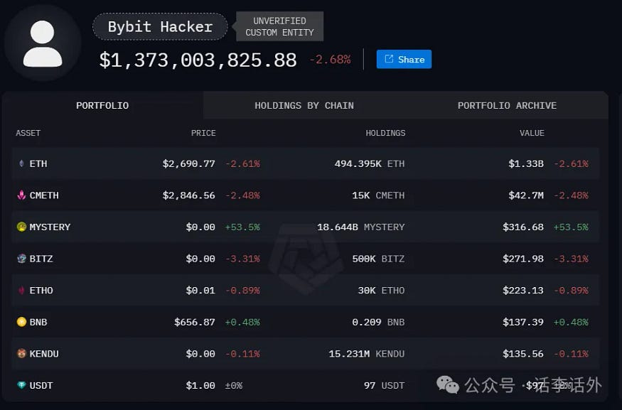 结果……到了晚上,市场就迎来了黑天鹅事件:Bybit 交易所遭遇黑客攻击,超过 51 万枚 ETH 被盗(价值约 15 亿美元,包括 401,347 枚 ETH、90,376 枚 stETH、15,000 枚 cmETH 以及 8,000 枚 mETH)。