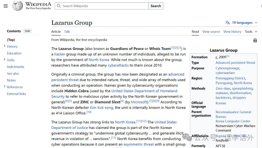 朝鲜的黑客组织 Lazarus Group 自 2010 年以来已经被指控实施了多起网络攻击,包括索尼影视入侵、2016 年银行盗窃案、「WannaCry」勒索软件攻击,以及针对加密货币和制药公司的多次袭击。如下图所示。