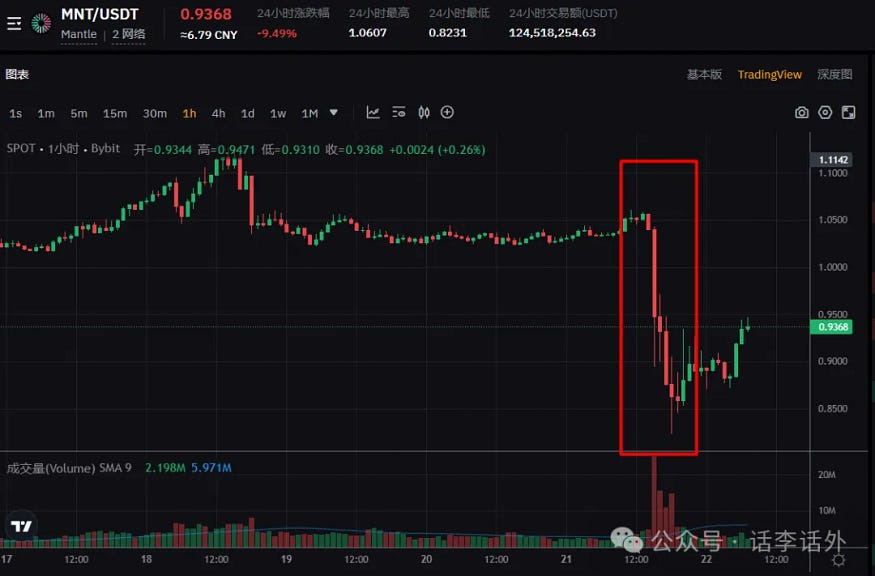 - MNT(即 Bybit 的代币)在几分钟内下跌了 10%,如下图所示。