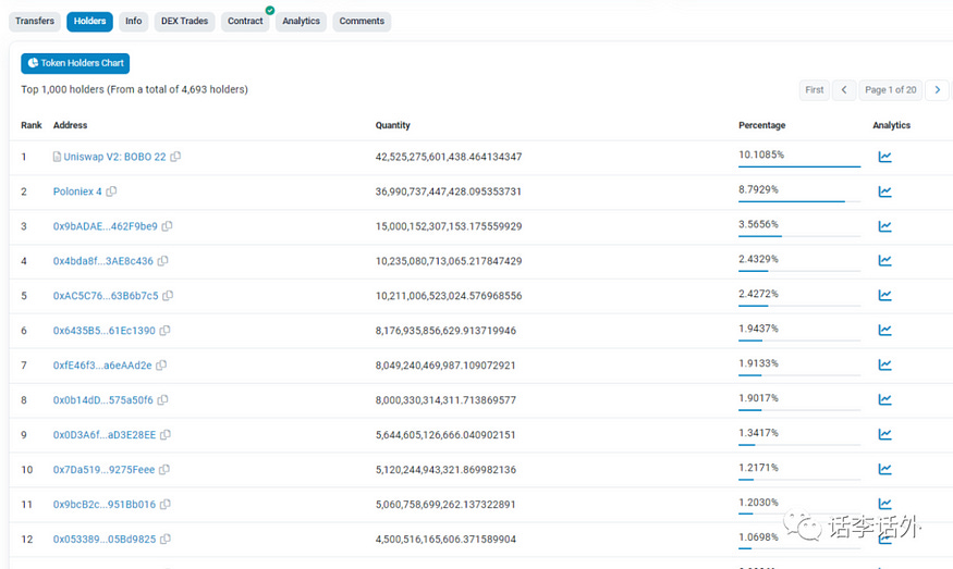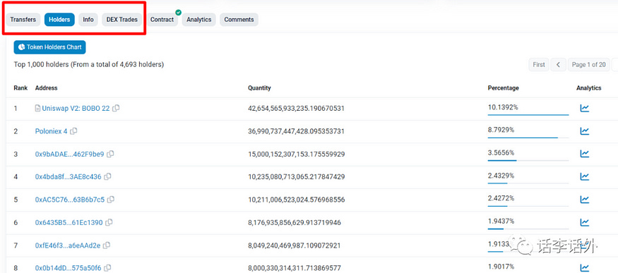 通过单击合约地址页面的 holders(持有人),你就可以直接找到该Token的最高持有人。如下图所示。