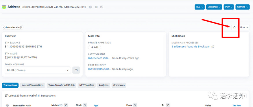 另外,如果你想收到对应合约地址或钱包地址的最新交易通知,那么还可以将他们加入你的关注列表,直接点击页面右上角的收藏图标即可,这样方便后继查看。如下图所示。