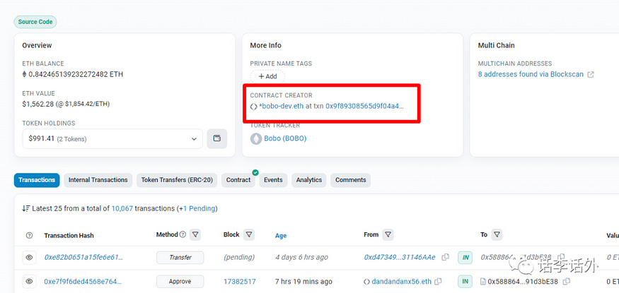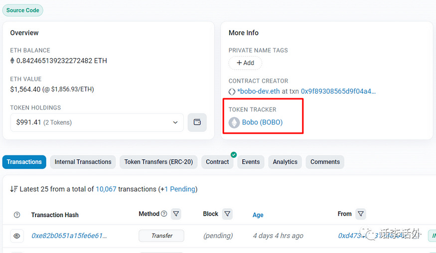 有些小伙伴可能也会比较关心对应Token的合约到底是谁创建的!但这也正是 Contract Creator 比较有趣的一个地方,也许合约的创建者就是项目的部署者,但实际情况也并非总是如此。