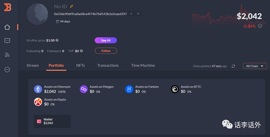 然后,你再借助另外的一些链上工具,比如我们之前的文章已经介绍过的 Debank 或 BubbleMaps(气泡图)工具,就可以进一步查询到该钱包的所有持仓情况及历史交易信息。也许,你可以在里面发现点儿什么对自己有用的线索呢!如下图所示(这里以Debank为例)。